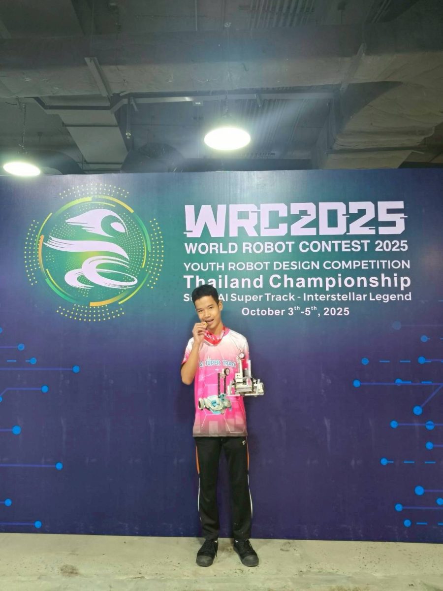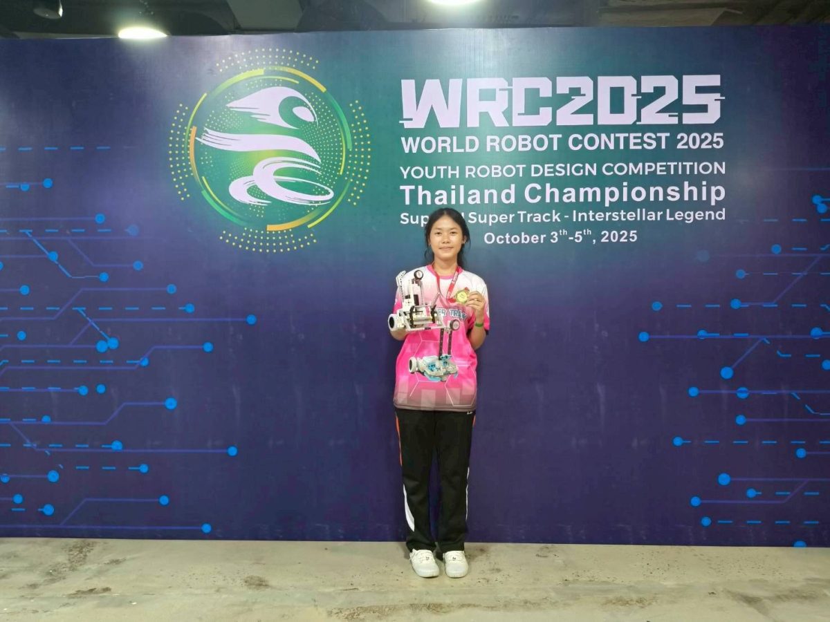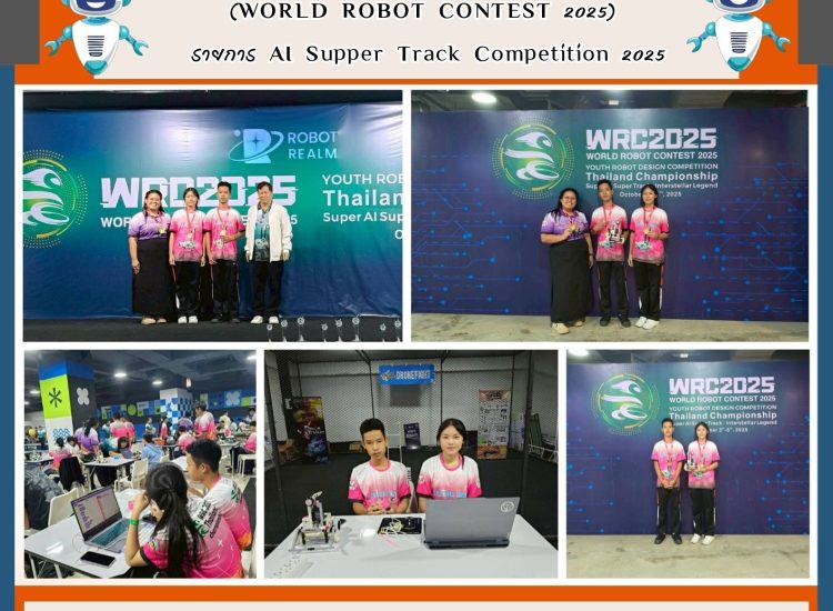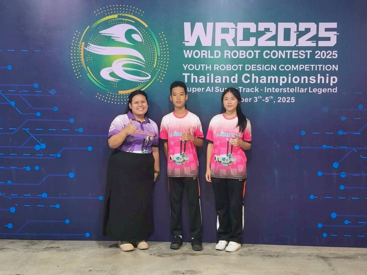 นางสุรีย์พร ศรีวัฒนะ ผู้อำนวยการโรงเรียนทุ่งศุขลาพิทยา“กรุงไทยอนุเคราะห์” มอบหมายให้ นางสาวบุษกร สุภาผล นำนักเรียนเข้าร่วมการแข่งขันหุ่นยนต์นานาชาติ WRC 2025 (WORLD ROBOT CONTEST 2025) รายการ AI Supper Track Competition 2025 ตำนานแห่งดวงดาว ณ ศูนย์การค้า เซียร์ รังสิต จังหวัดปทุมธานี ได้รับรางวัลระดับเหรียญทอง