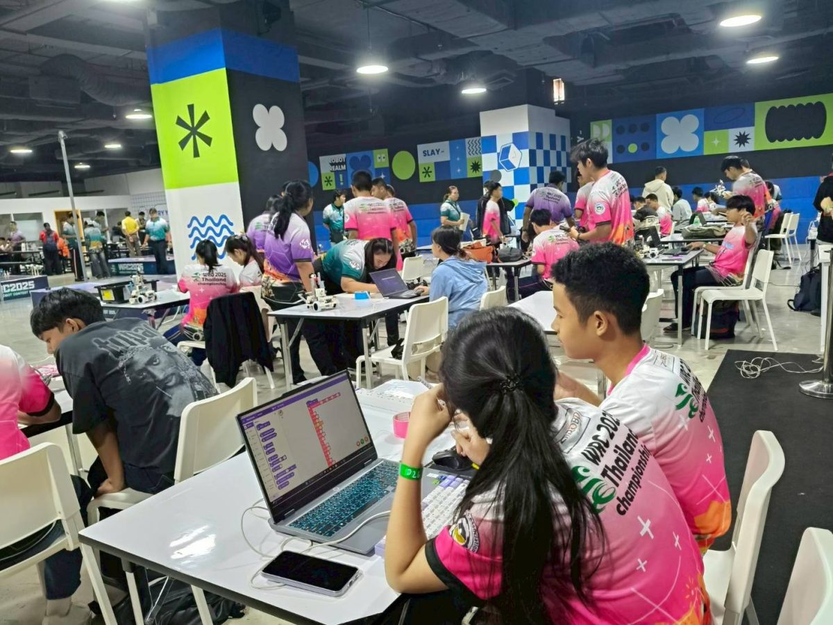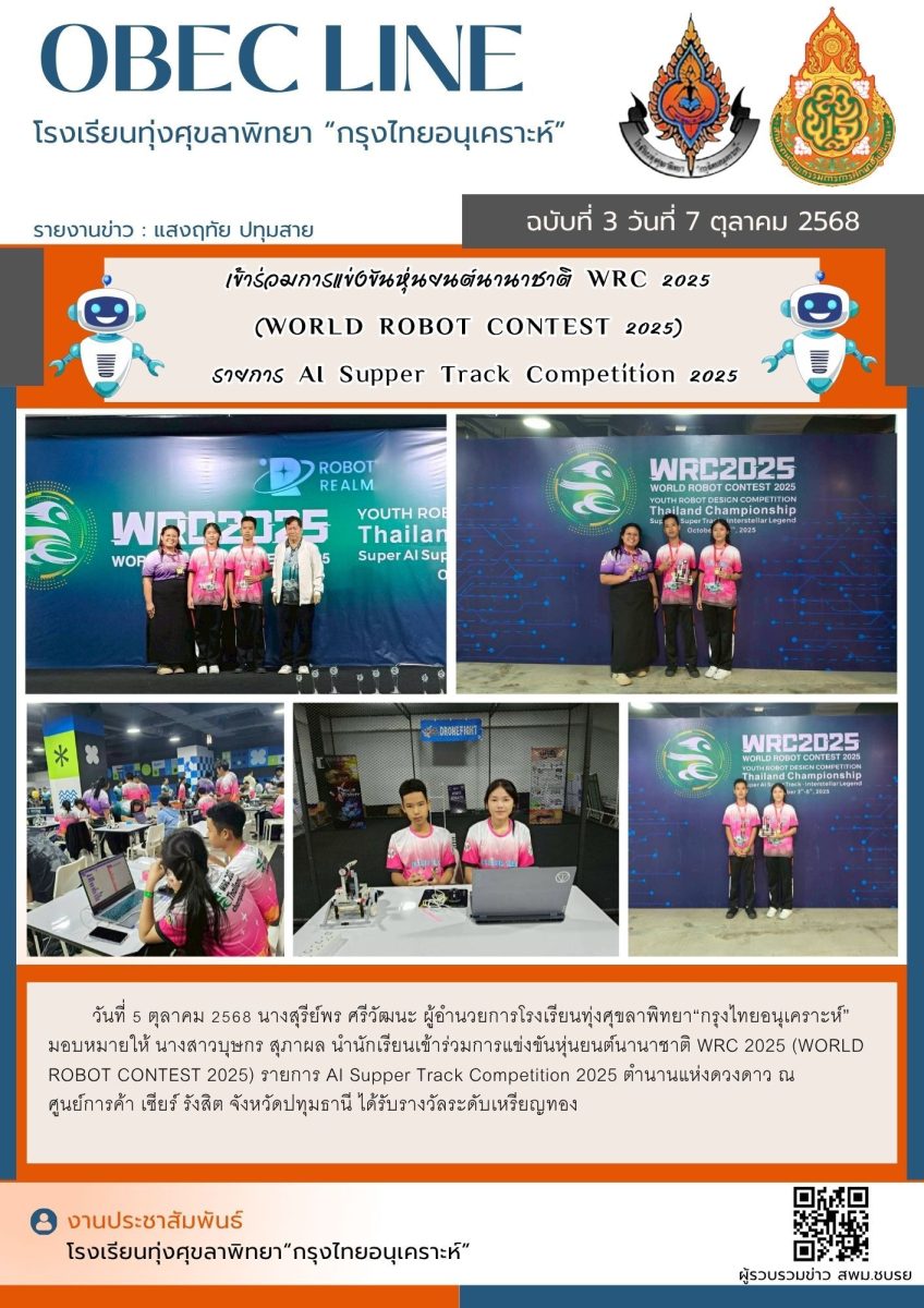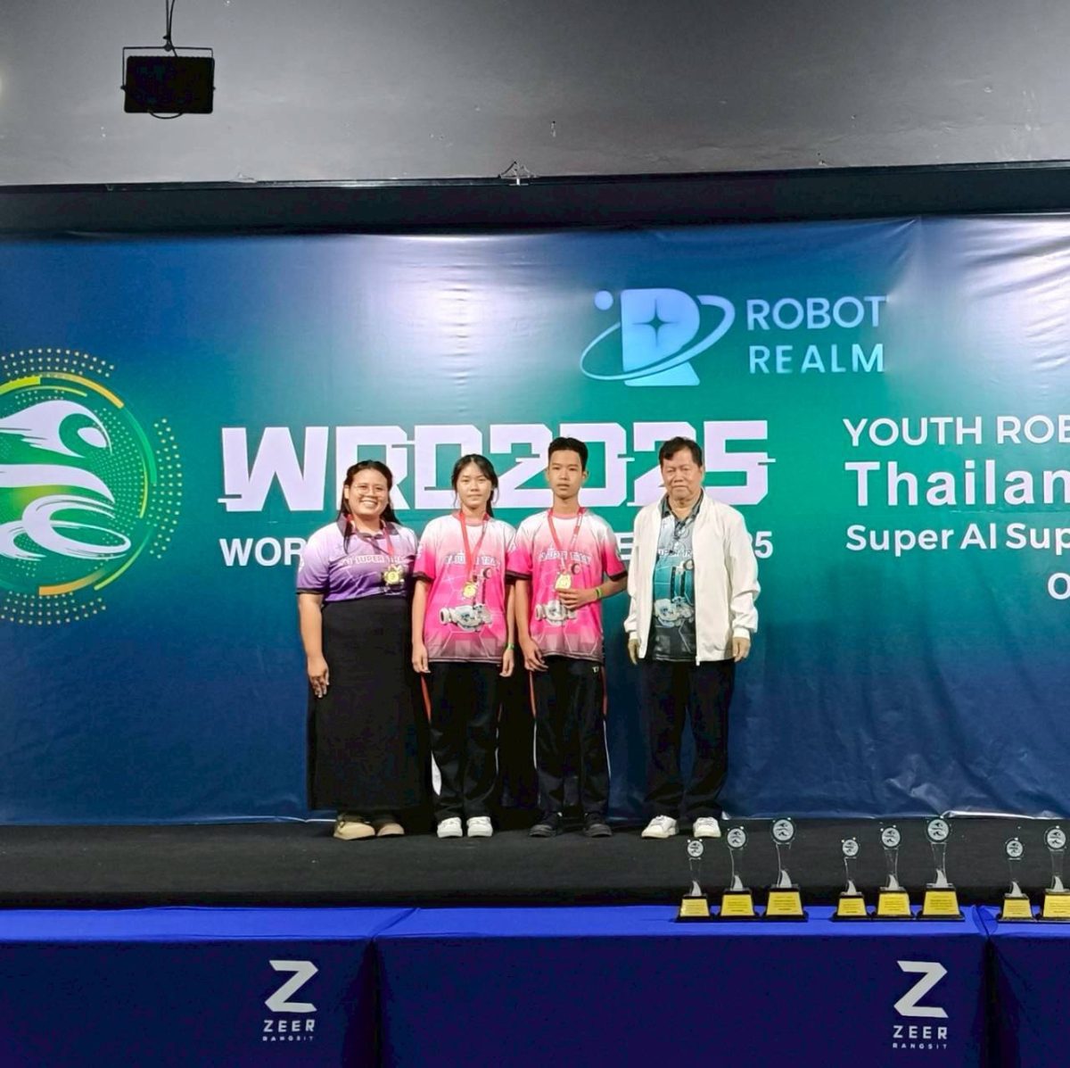 นางสุรีย์พร ศรีวัฒนะ ผู้อำนวยการโรงเรียนทุ่งศุขลาพิทยา“กรุงไทยอนุเคราะห์” มอบหมายให้ นางสาวบุษกร สุภาผล นำนักเรียนเข้าร่วมการแข่งขันหุ่นยนต์นานาชาติ WRC 2025 (WORLD ROBOT CONTEST 2025) รายการ AI Supper Track Competition 2025 ตำนานแห่งดวงดาว ณ ศูนย์การค้า เซียร์ รังสิต จังหวัดปทุมธานี ได้รับรางวัลระดับเหรียญทอง