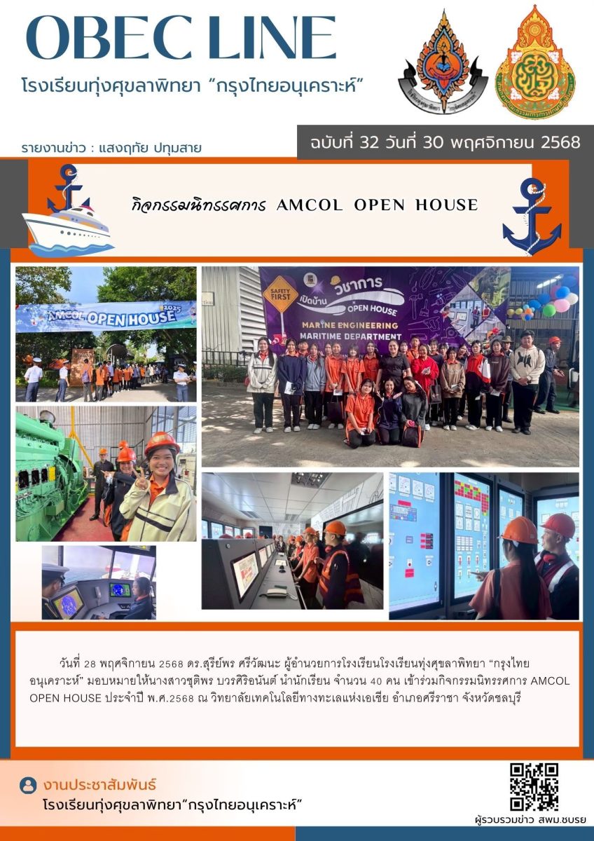 ดร.สุรีย์พร ศรีวัฒนะ ผู้อำนวยการโรงเรียนทุ่งศุขลาพิทยา “กรุงไทยอนุเคราะห์” มอบหมายให้นางสาวชุติพร บวรศิริอนันต์ นำนักเรียน จำนวน 40 คน เข้าร่วมกิจกรรมนิทรรศการ AMCOL OPEN HOUSE ประจำปี พ.ศ.2568 ณ วิทยาลัยเทคโนโลยีทางทะเลแห่งเอเชีย อำเภอศรีราชา จังหวัดชลบุรี