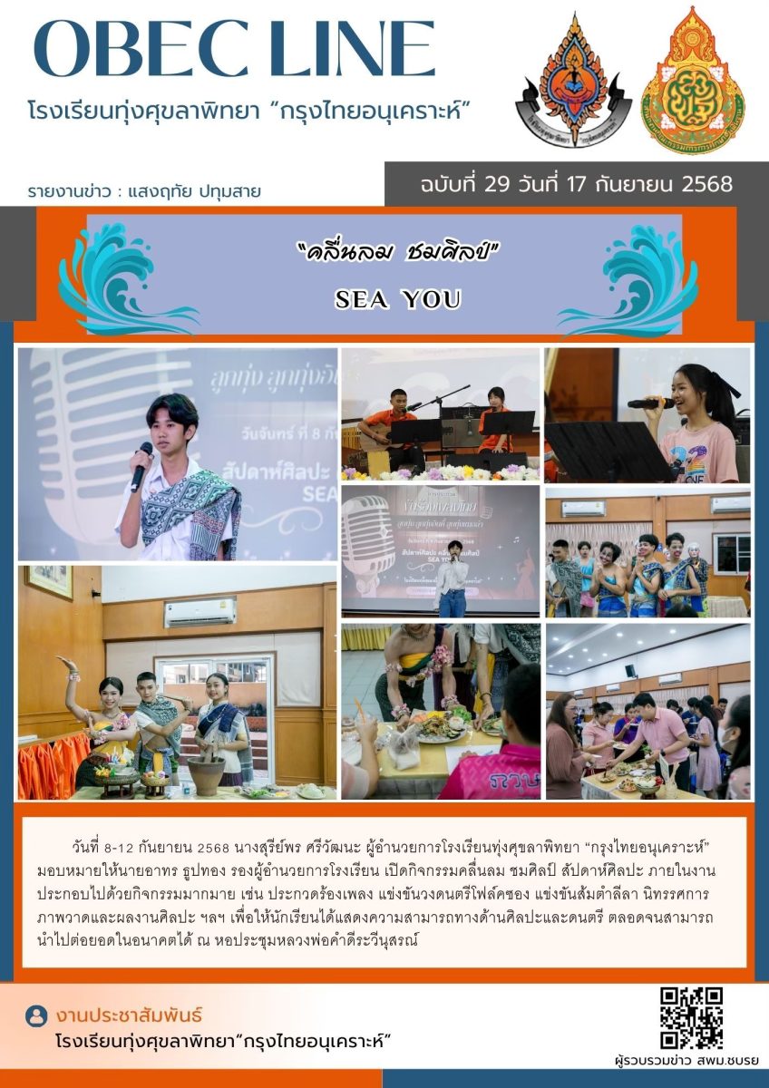 ระหว่างวันที่ 2 – 12 กันยายน 2568 โรงเรียนทุ่งศุขลาพิทยา “กรุงไทยอนุเคราะห์” โดยคณะครูกลุ่มสาระการเรียนรู้ศิลปะ ได้จัดกิจกรรม สัปดาห์ศิลปะ ประจำปีการศึกษา 2568 ขึ้น เพื่อส่งเสริมความรู้ ความสามารถ และทักษะด้านศิลปะของนักเรียน พร้อมเปิดโอกาสให้นักเรียนได้แสดงออกอย่างสร้างสรรค์