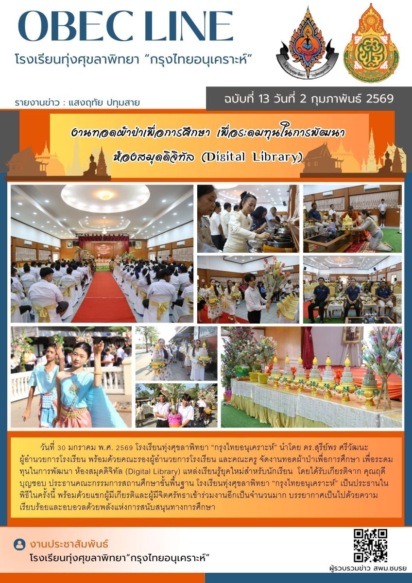 โรงเรียนทุ่งศุขลาพิทยา “กรุงไทยอนุเคราะห์” นำโดย ดร.สุรีย์พร ศรีวัฒนะ ผู้อำนวยการโรงเรียน พร้อมด้วยคณะรองผู้อำนวยการ และคณะครู จัดงานทอดผ้าป่าเพื่อการศึกษา เพื่อระดมทุนในการพัฒนา ห้องสมุดดิจิทัล (Digital Library) แหล่งเรียนรู้ยุคใหม่สำหรับนักเรียน