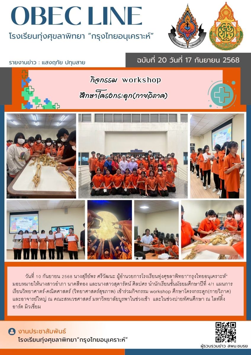 นางสุรีย์พร ศรีวัฒนะ ผู้อำนวยการโรงเรียนทุ่งศุขลาพิทยา“กรุงไทยอนุเคราะห์“ มอบหมายให้นางสาวอำภา นาคสีทอง และนางสาวสุดารัตน์ ศิลปศร นำนักเรียนชั้นมัธยมศึกษาปีที่ 4/1 แผนการเรียนวิทยาศาตร์-คณิตศาสตร์ (วิทยาศาสตร์สุขภาพ) เข้าร่วมกิจกรรม workshop ศึกษาโครงกระดูก(กายวิภาค) และอาจารย์ใหญ่ ณ คณะสหเวชศาสตร์ มหาวิทยาลัยบูรพาในช่วงเช้า และทัศนศึกษา ณ ไลท์ติ้ง อาร์ต มิวเซี่ยม ในช่วงบ่าย