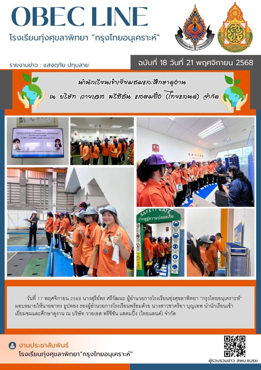 วันจันทร์ที่ 17 พฤศจิกายน 2568 นางสุรีย์พร ศรีวัฒนะ ผู้อำนวยการโรงเรียนทุ่งศุขลาพิทยา “กรุงไทยอนุเคราะห์” มอบหมายให้นายอาทร ธูปทอง รองผู้อำนวยการโรงเรียน,พร้อมด้วย นางสาวชาคริยา บุญเทพ นำนักเรียนเข้าเยี่ยมชมและศึกษาดูงาน ณ บริษัท วายเอส พรีซีชั่น แสตมปิ้ง (ไทยแลนด์) จำกัด