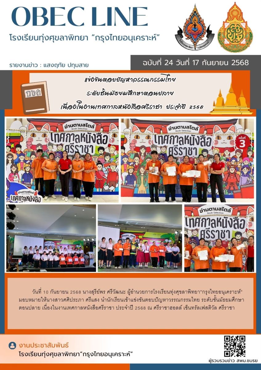 นางสุรีย์พร ศรีวัฒนะ ผู้อำนวยการโรงเรียนทุ่งศุขลาพิทยา“กรุงไทยอนุเคราะห์“ มอบหมายให้นางสาวศศิประภา ศรีแสง นำนักเรียนเข้าแข่งขันตอบปัญหาวรรณกรรมไทย ระดับชั้นมัธยมศึกษาตอนปลาย เนื่องในงานเทศกาลหนังสือศรีราชา ประจำปี 2568 ณ ศรีราชาฮอลล์ เซ็นทรัลเฟสติวัล ศรีราชา