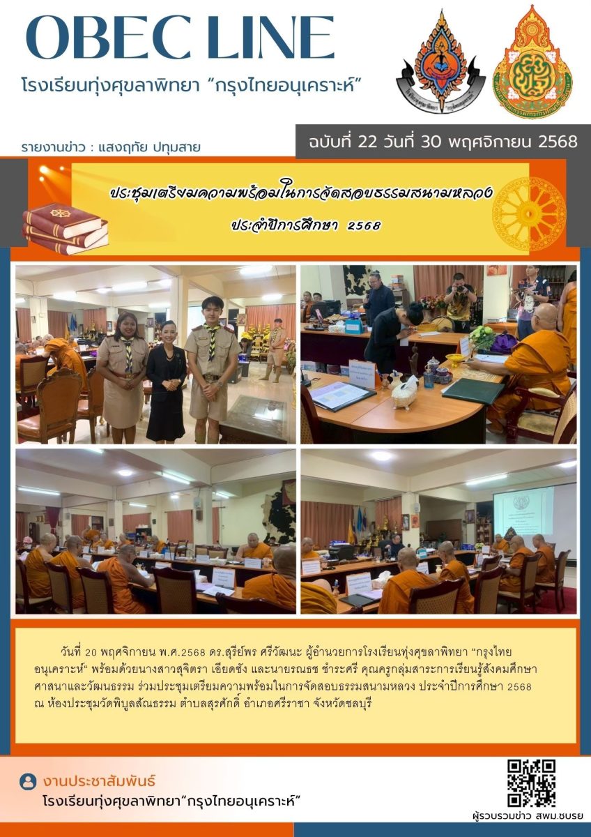 นำโดย ดร.สุรีย์พร ศรีวัฒนะ ผู้อำนวยการโรงเรียนทุ่งศุขลาพิทยา “กรุงไทยอนุเคราะห์“ พร้อมด้วยนางสาวสุจิตรา เอียดซัง และนายรณธช ชำระศรี คุณครูกลุ่มสาระการเรียนรู้สังคมศึกษาฯ ร่วมประชุมเตรียมความพร้อมในการจัดสอบธรรมสนามหลวง ประจำปีการศึกษา 2568 ณ ห้องประชุมวัดพิบูลสัณธรรม ตำบลสุรศักดิ์ อำเภอศรีราชา จังหวัดชลบุรี