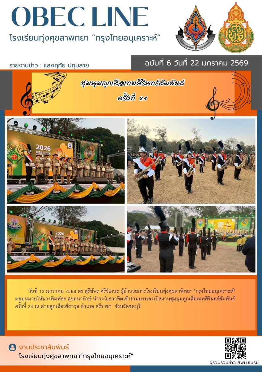 ดร.สุรีย์พร ศรีวัฒนะ ผู้อำนวยการโรงเรียนทุ่งศุขลาพิทยา “กรุงไทยอนุเคราะห์” มอบหมายให้นางพิมพ์อร สุขทนารักษ์ นำวงโยธวาทิตเข้าร่วมบรรเลงเปิดงานชุมนุมลูกเสือเทพศิรินทร์สัมพันธ์ ครั้งที่ 24 ณ ค่ายลูกเสือวชิราวุธ อำเภอ ศรีราชา จังหวัดชลบุรี