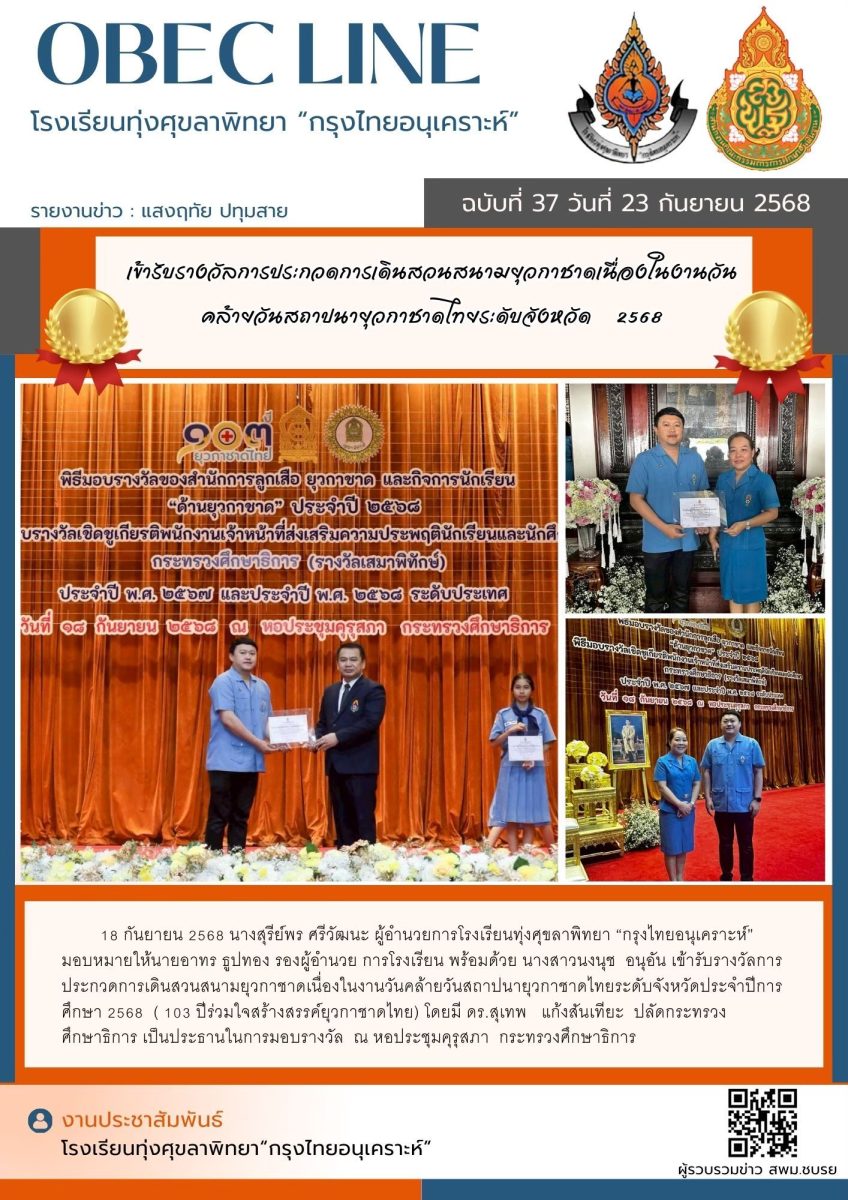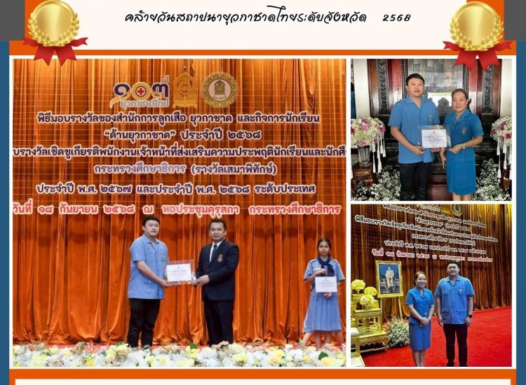 นางสุรีย์พร ศรีวัฒนะ ผู้อำนวยการโรงเรียนทุ่งศุขลาพิทยา “กรุงไทยอนุเคราะห์” มอบหมายให้นายอาทร ธูปทอง รองผู้อำนวย การโรงเรียน พร้อมด้วย นางสาวนงนุช อนุอัน เข้ารับรางวัลการประกวดการเดินสวนสนามยุวกาชาดเนื่องในงานวันคล้ายวันสถาปนายุวกาชาดไทยระดับจังหวัดประจำปีการศึกษา 2568 ( 103 ปีร่วมใจสร้างสรรค์ยุวกาชาดไทย)
