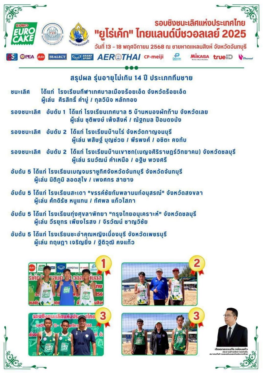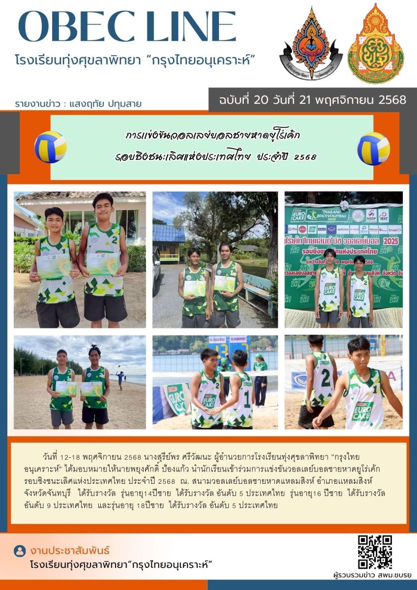 ระหว่างวันที่12-18 พฤศจิกายน 2568 นางสุรีย์พร ศรีวัฒนะ ผู้อำนวยการโรงเรียนทุ่งศุขลาพิทยา “กรุงไทยอนุเคราะห์“ ได้มอบหมายให้นายพยุงศักดิ์ ป้องแก้ว นำนักเรียนเข้าร่วมการเเข่งขันวอลเลย์บอลชายหาดยูโร่เค้ก รอบชิงชนะเลิศแห่งประเทศไทย ประจำปี 2568 ณ. สนามวอลเลย์บอลชายหาดแหลมสิงห์ อำเภอเเหลมสิงห์ จังหวัดจันทบุรี ได้รับรางวัล