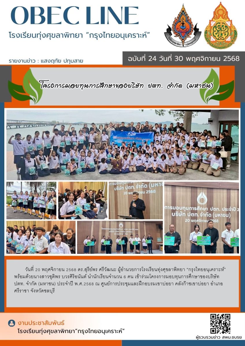 ดร.สุรีย์พร ศรีวัฒนะ ผู้อำนวยการโรงเรียนทุ่งศุขลาพิทยา “กรุงไทยอนุเคราะห์” พร้อมด้วยนางสาวชุติพร บวรศิริอนันต์ นำนักเรียนจำนวน 6 คน เข้าร่วมโครงการมอบทุนการศึกษาของบริษัท ปตท. จำกัด (มหาชน) ประจำปี พ.ศ.2568 ณ ศูนย์การประชุมและฝึกอบรมเขาบ่อยา คลังก๊าซเขาบ่อยา อำเภอศรีราชา จังหวัดชลบุรี