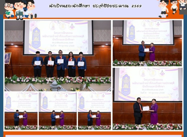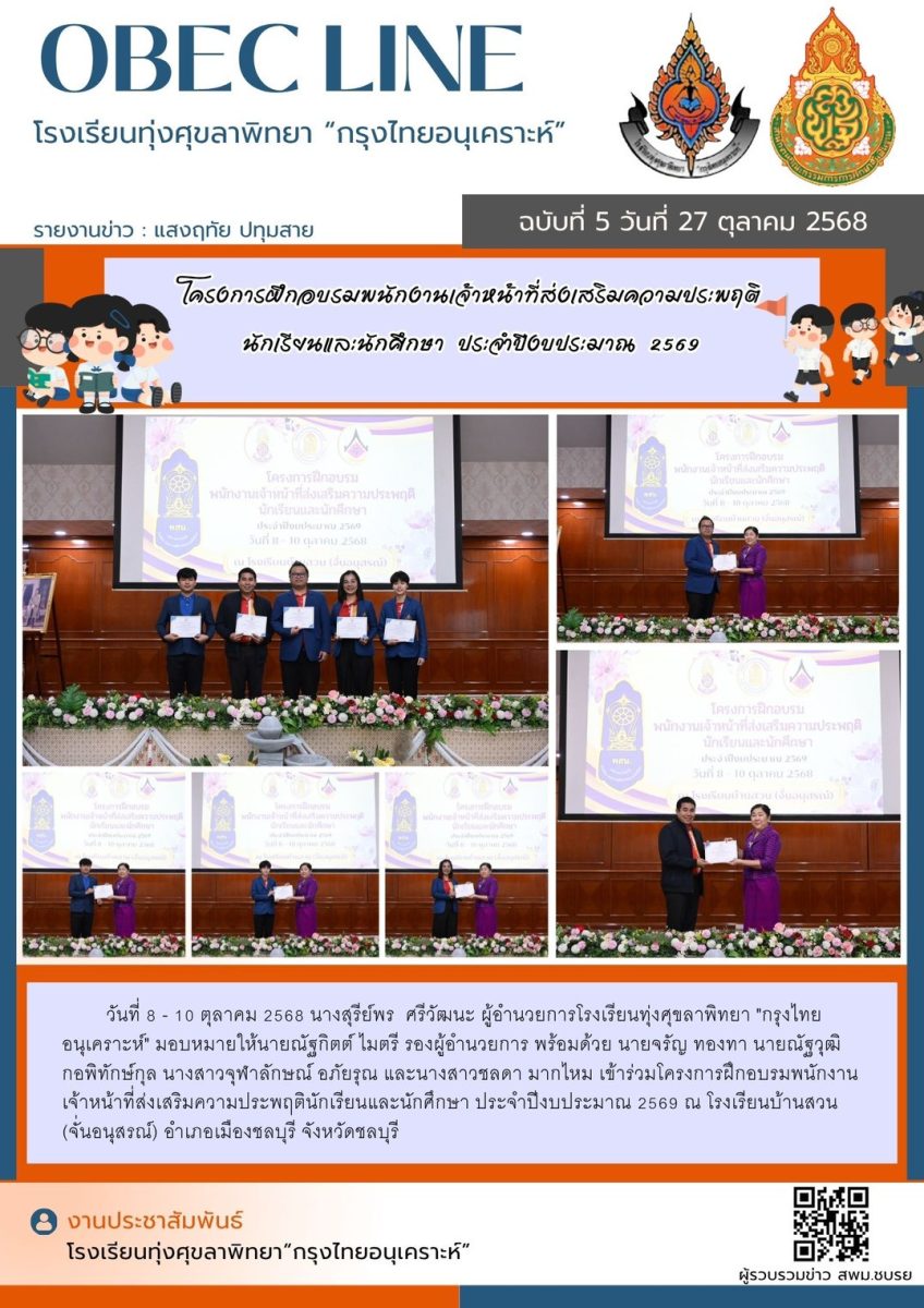 นางสุรีย์พร ศรีวัฒนะ ผู้อำนวยการโรงเรียนทุ่งศุขลาพิทยา “กรุงไทยอนุเคราะห์” มอบหมายให้นายณัฐกิตต์ ไมตรี รองผู้อำนวยการ พร้อมด้วย นายจรัญ ทองทา, นายณัฐวุฒิ กอพิทักษ์กุล, นางสาวจุฬาลักษณ์ อภัยรุณ และนางสาวชลดา มากไหม เข้าร่วมโครงการฝึกอบรมพนักงานเจ้าหน้าที่ส่งเสริมความประพฤตินักเรียนและนักศึกษา ประจำปีงบประมาณ 2569 ณ โรงเรียนบ้านสวน (จั่นอนุสรณ์) อำเภอเมืองชลบุรี จังหวัดชลบุรี